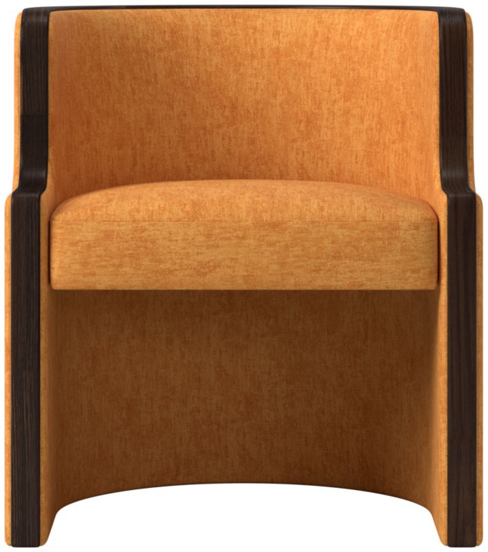 Classic-meets-contemporary barrel chair by Brett Beldock is wrapped in fabric and outlined by a thick band of solid American red oak certified sustainable by the Forest Stewardship Council®. Makes a bold statement as an end chair or can be used as a side chair. CB2 exclusive.