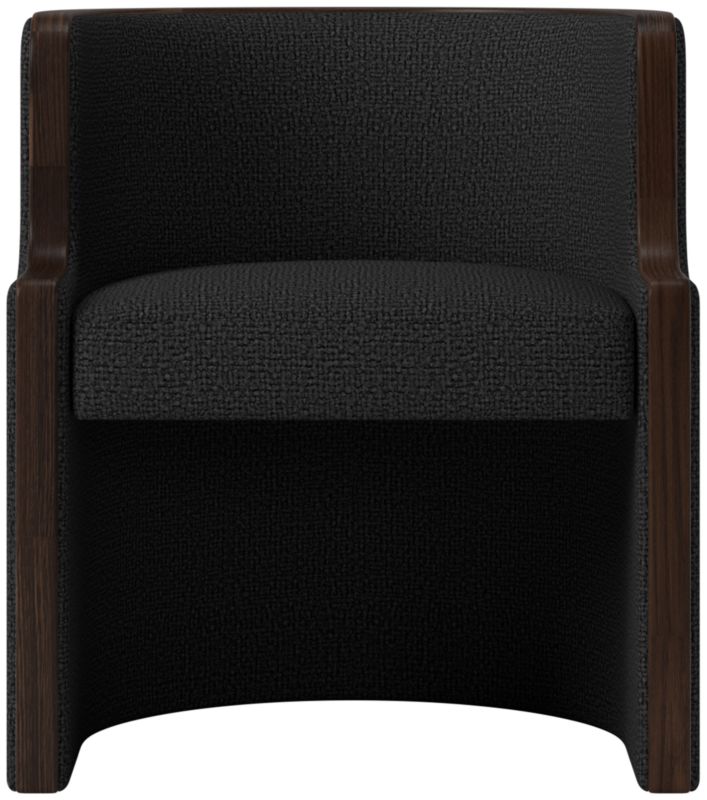 Classic-meets-contemporary barrel chair by Brett Beldock is wrapped in fabric and outlined by a thick band of solid American red oak certified sustainable by the Forest Stewardship Council®. Makes a bold statement as an end chair or can be used as a side chair. CB2 exclusive.