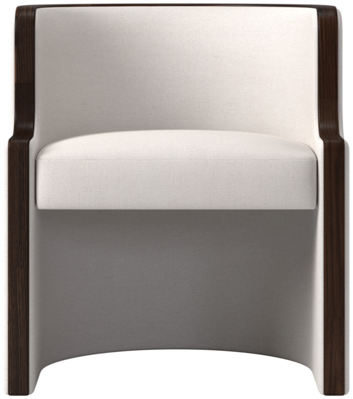 Classic-meets-contemporary barrel chair by Brett Beldock is wrapped in fabric and outlined by a thick band of solid American red oak certified sustainable by the Forest Stewardship Council®. Makes a bold statement as an end chair or can be used as a side chair. CB2 exclusive.