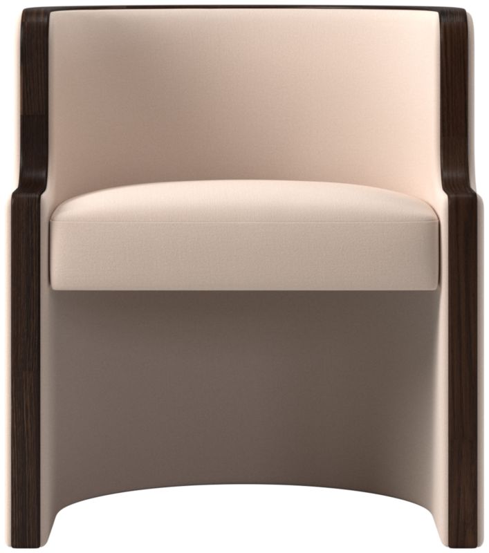 Classic-meets-contemporary barrel chair by Brett Beldock is wrapped in fabric and outlined by a thick band of solid American red oak certified sustainable by the Forest Stewardship Council®. Makes a bold statement as an end chair or can be used as a side chair. CB2 exclusive.