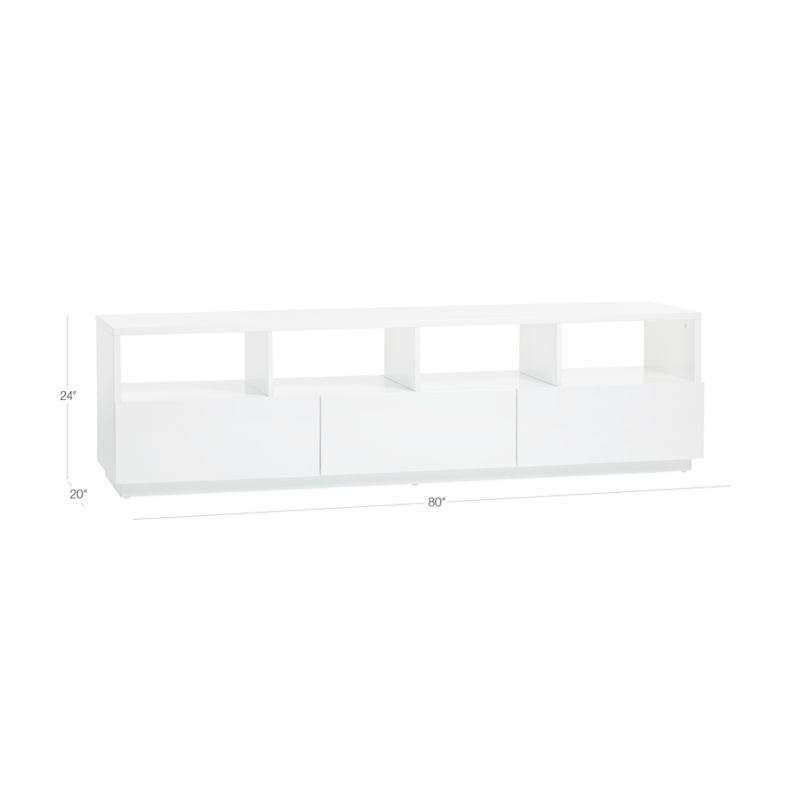 Thoughtful details and workmanship by Eric Pfeiffer at an exceptionally thoughtful CB2 price (of course). Four open component cubbies span over three XL closed drawers angled to open sans pulls on smooth metal glides. Smart details you can't see here: back is completely finished—all white, all around—so it can float in the room; center media cutouts funnel cords to an integrated ledge along the entire lower back edge then out the bottom to tidy up wires. Engineered wood slicked in hi-gloss lacquer. Chill Large White Media Console is a CB2 exclusive.