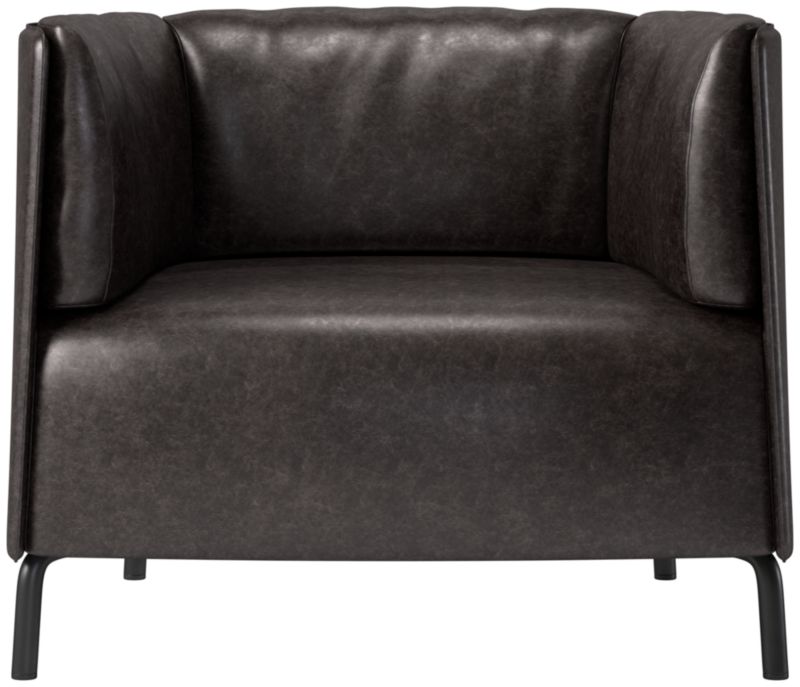 Modern leather lounge chair by award-winning Japanese designer Ryuichi Kozeki features a shelter-style back for enveloping comfort. "The lounge chair is designed to create grand comfort through a simple structure and bold configuration," explains the designer. Resting atop slim blackened stainless steel legs, the minimalist frame is wrapped in Moore & Giles full-grain aniline leather that is hand-selected for its inherent markings and characteristics. The leather upholstery is finished by hand for a naturally worn-in aesthetic. CB2 exclusive.