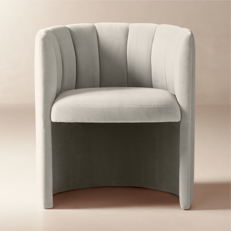From Barcelona-based Mermelada Estudio, barrel-back dining armchair is a subtle nod the bold silhouettes of Art Deco design. Fully upholstered in ivory faux mohair, the chair's channel-tufted back wraps around a generously cushioned seat for a supportive sit. CB2 exclusive.