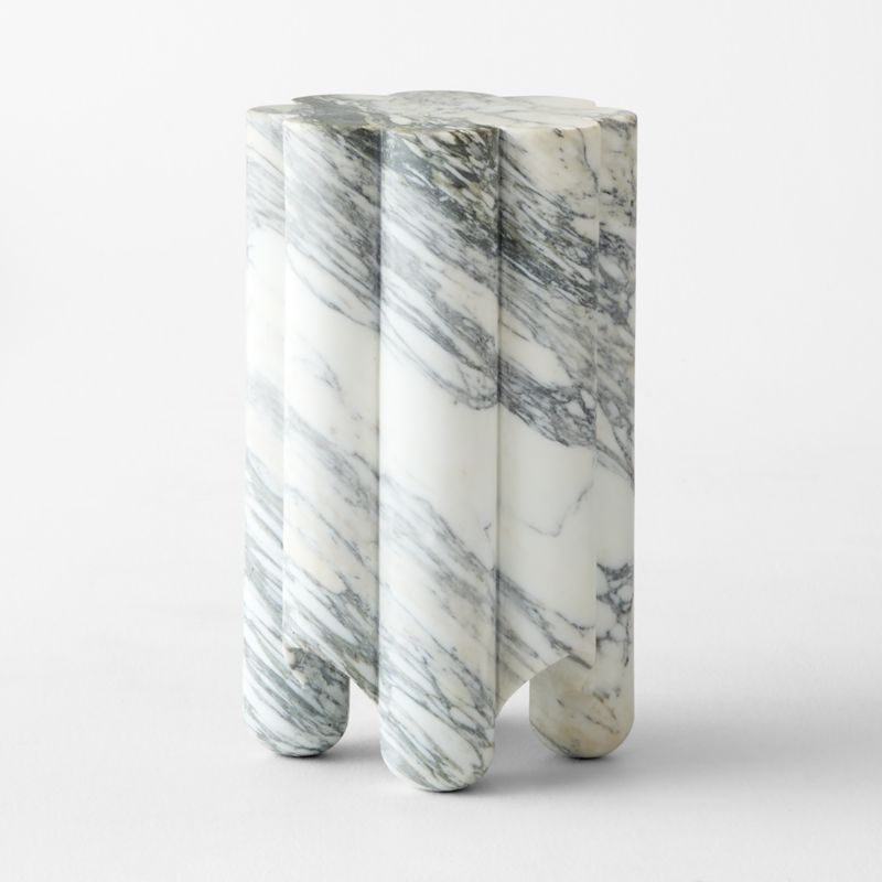 goop is a work of art with an incredibly functional design. Defined by its soft curves, the side table is crafted of solid Arabescato marble that has been carefully selected, carved and polished by hand. Quarried in Chiampo, Italy, the active marble is prized for its lacy grey veining, making each table naturally one of a kind. The subtle differences in the activity of the marble are especially striking when paired with the Clemence short side table. CB2 exclusive.