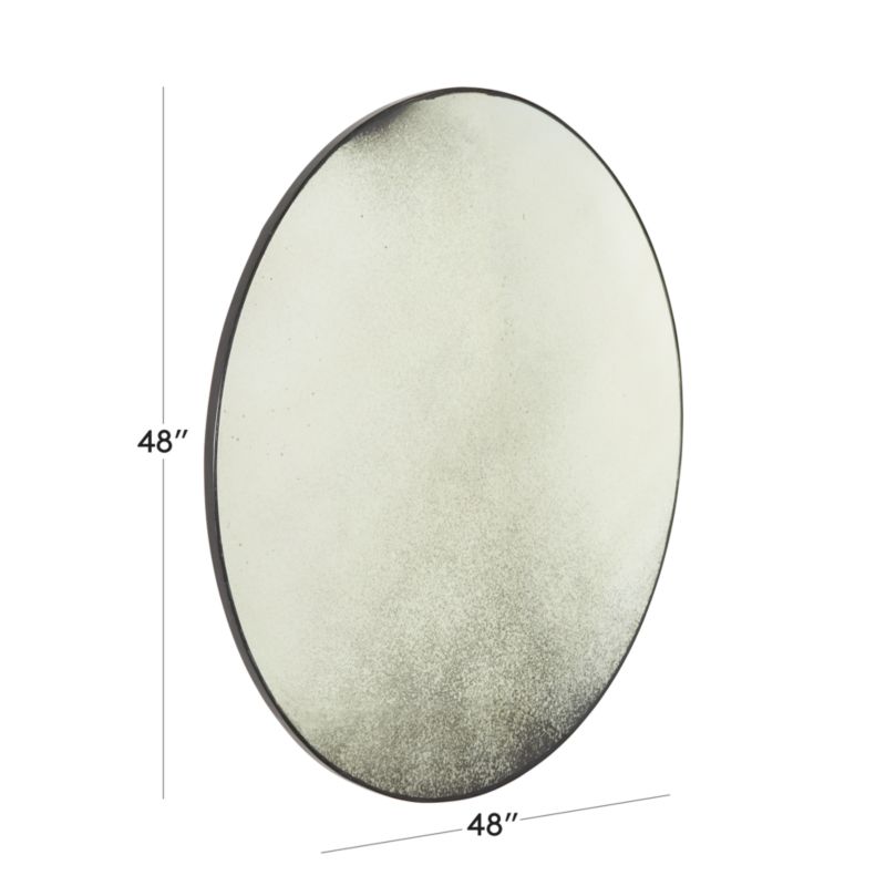 Oversized round mirror is hand-aged and antiqued for seriously vintage vibes while industrial black iron frame keeps it from going too flea market. Hang in the bedroom or hallway for major modern drama. CB2 exclusive.