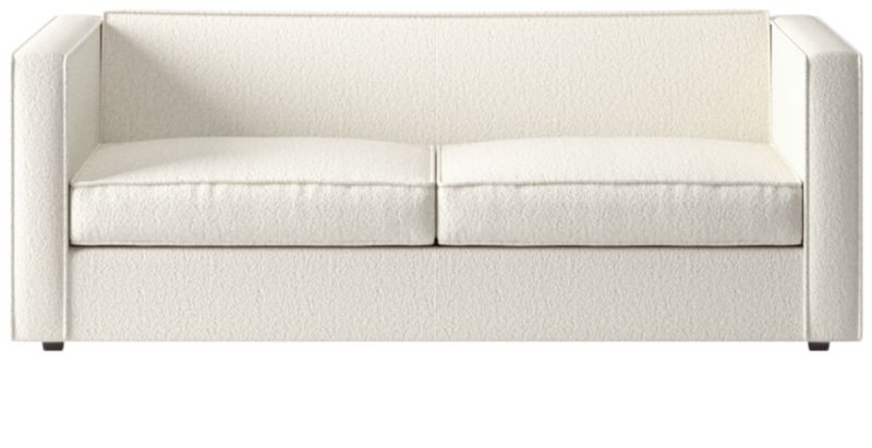 Sheltering club sofa turns tradition on its edge. Compact two-seater sofa to the nines with exaggerated flange that outlines boxy design. Love the impromptu feel of the intentional seat cushion overhang and super comfy back that curves to relax/support just where you need it.