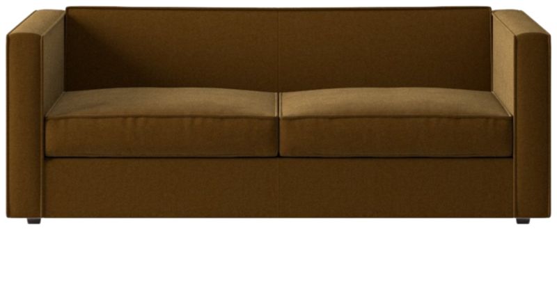 Sheltering club sofa turns tradition on its edge. Compact two-seater sofa to the nines with exaggerated flange that outlines boxy design. Love the impromptu feel of the intentional seat cushion overhang and super comfy back that curves to relax/support just where you need it.