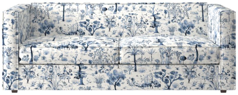 Sheltering club sofa turns tradition on its edge. Compact two-seater sofa to the nines with exaggerated flange that outlines boxy design. Love the impromptu feel of the intentional seat cushion overhang and super comfy back that curves to relax/support just where you need it.