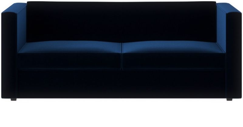 Sheltering sofa turns tradition on its edge. Compact two-seater with exaggerated flange outlines boxy design. Love the impromptu feel of the intentional seat cushion overhang and super comfy back that curves to relax/support just where you need it. Off with the cushions to pull out the coil/foam queen mattress in one smooth move.