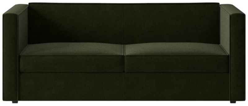 Sheltering sofa turns tradition on its edge. Compact two-seater with exaggerated flange outlines boxy design. Love the impromptu feel of the intentional seat cushion overhang and super comfy back that curves to relax/support just where you need it. Off with the cushions to pull out the coil/foam queen mattress in one smooth move.