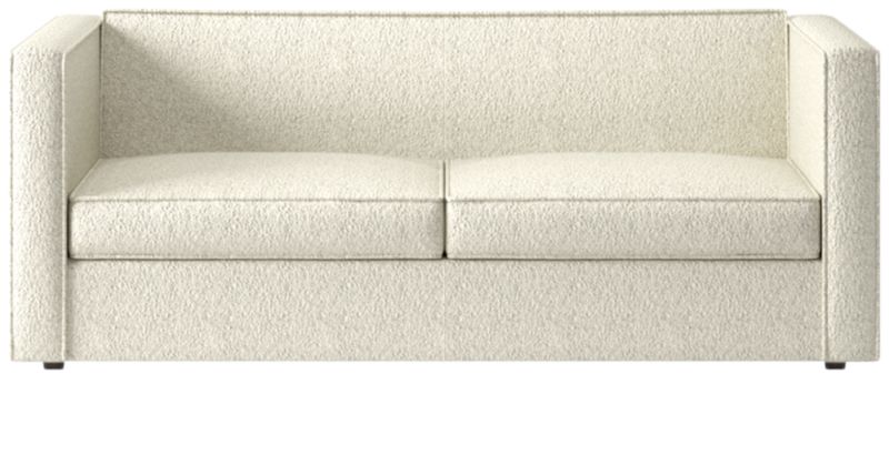 Sheltering sofa turns tradition on its edge. Compact two-seater with exaggerated flange outlines boxy design. Love the impromptu feel of the intentional seat cushion overhang and super comfy back that curves to relax/support just where you need it. Off with the cushions to pull out the coil/foam queen mattress in one smooth move.