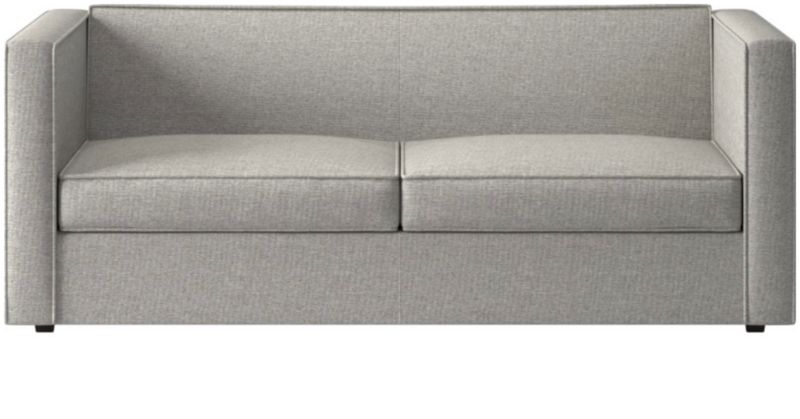Sheltering sofa turns tradition on its edge. Compact two-seater with exaggerated flange outlines boxy design. Love the impromptu feel of the intentional seat cushion overhang and super comfy back that curves to relax/support just where you need it. Off with the cushions to pull out the coil/foam queen mattress in one smooth move.