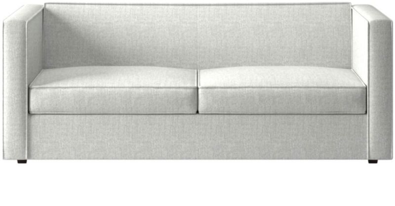 Sheltering sofa turns tradition on its edge. Compact two-seater with exaggerated flange outlines boxy design. Love the impromptu feel of the intentional seat cushion overhang and super comfy back that curves to relax/support just where you need it. Off with the cushions to pull out the coil/foam queen mattress in one smooth move.