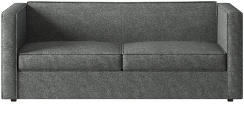 Sheltering sofa turns tradition on its edge. Compact two-seater with exaggerated flange outlines boxy design. Love the impromptu feel of the intentional seat cushion overhang and super comfy back that curves to relax/support just where you need it. Off with the cushions to pull out the coil/foam queen mattress in one smooth move.