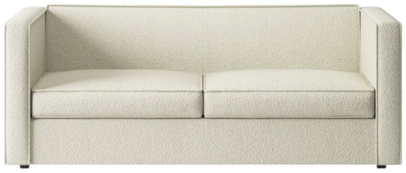 Sheltering sofa turns tradition on its edge. Compact two-seater with exaggerated flange outlines boxy design. Love the impromptu feel of the intentional seat cushion overhang and super comfy back that curves to relax/support just where you need it. Off with the cushions to pull out the coil/foam queen mattress in one smooth move.