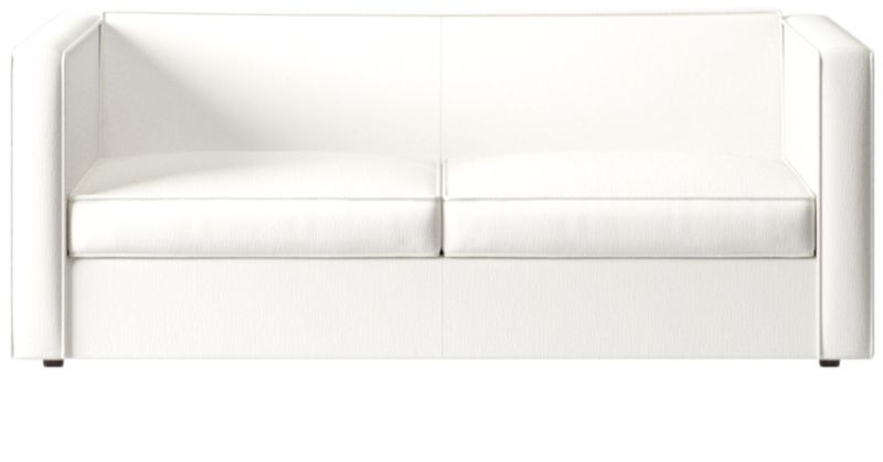 Sheltering sofa turns tradition on its edge. Compact two-seater with exaggerated flange outlines boxy design. Love the impromptu feel of the intentional seat cushion overhang and super comfy back that curves to relax/support just where you need it. Off with the cushions to pull out the coil/foam queen mattress in one smooth move.