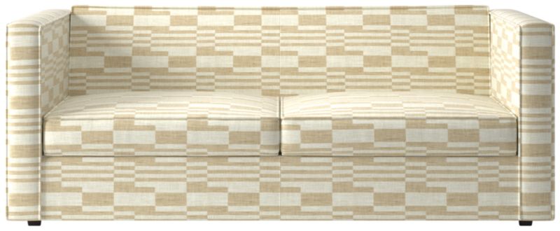Sheltering sofa turns tradition on its edge. Compact two-seater with exaggerated flange outlines boxy design. Love the impromptu feel of the intentional seat cushion overhang and super comfy back that curves to relax/support just where you need it. Off with the cushions to pull out the coil/foam queen mattress in one smooth move.
