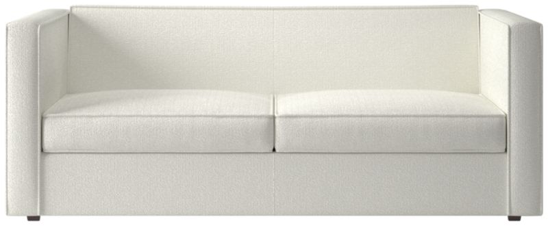 Sheltering sofa turns tradition on its edge. Compact two-seater with exaggerated flange outlines boxy design. Love the impromptu feel of the intentional seat cushion overhang and super comfy back that curves to relax/support just where you need it. Off with the cushions to pull out the coil/foam queen mattress in one smooth move.