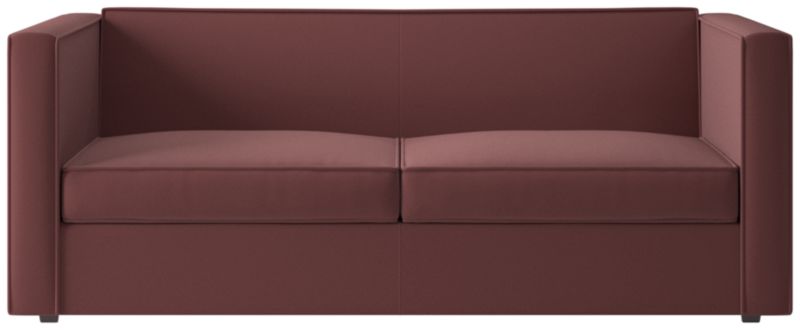 Sheltering sofa turns tradition on its edge. Compact two-seater with exaggerated flange outlines boxy design. Love the impromptu feel of the intentional seat cushion overhang and super comfy back that curves to relax/support just where you need it. Off with the cushions to pull out the coil/foam queen mattress in one smooth move.