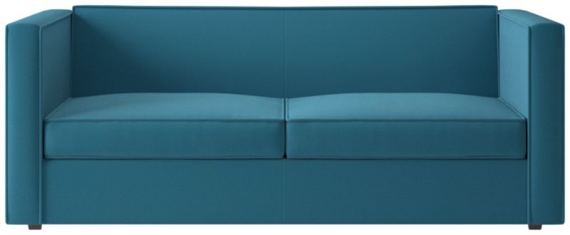 Sheltering sofa turns tradition on its edge. Compact two-seater with exaggerated flange outlines boxy design. Love the impromptu feel of the intentional seat cushion overhang and super comfy back that curves to relax/support just where you need it. Off with the cushions to pull out the coil/foam queen mattress in one smooth move.