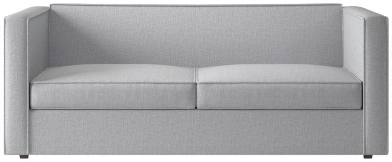 Sheltering sofa turns tradition on its edge. Compact two-seater with exaggerated flange outlines boxy design. Love the impromptu feel of the intentional seat cushion overhang and super comfy back that curves to relax/support just where you need it. Off with the cushions to pull out the coil/foam queen mattress in one smooth move.