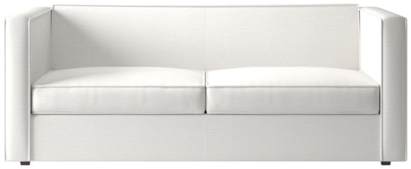 Sheltering sofa turns tradition on its edge. Compact two-seater with exaggerated flange outlines boxy design. Love the impromptu feel of the intentional seat cushion overhang and super comfy back that curves to relax/support just where you need it. Off with the cushions to pull out the coil/foam queen mattress in one smooth move.
