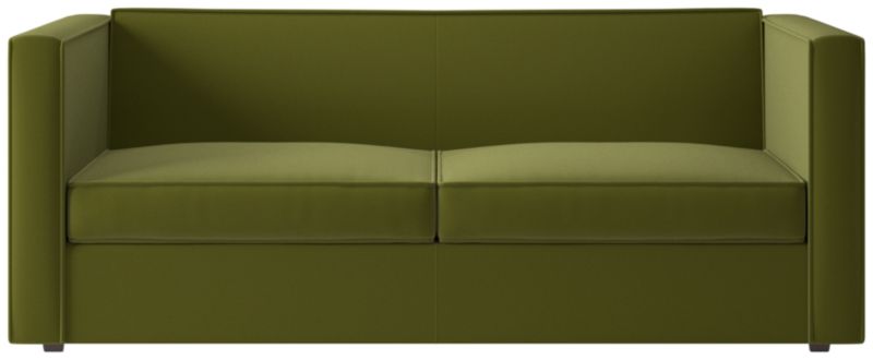 Sheltering sofa turns tradition on its edge. Compact two-seater with exaggerated flange outlines boxy design. Love the impromptu feel of the intentional seat cushion overhang and super comfy back that curves to relax/support just where you need it. Off with the cushions to pull out the coil/foam queen mattress in one smooth move.
