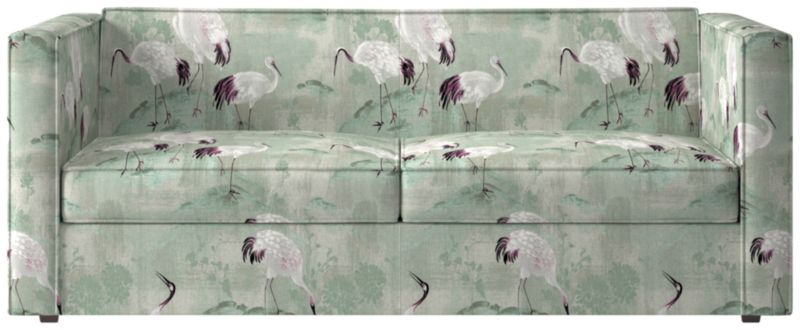 Sheltering sofa turns tradition on its edge. Compact two-seater with exaggerated flange outlines boxy design. Love the impromptu feel of the intentional seat cushion overhang and super comfy back that curves to relax/support just where you need it. Off with the cushions to pull out the coil/foam queen mattress in one smooth move.