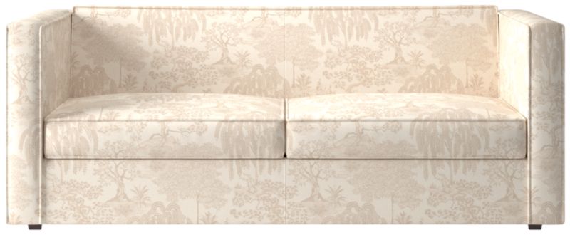 Sheltering sofa turns tradition on its edge. Compact two-seater with exaggerated flange outlines boxy design. Love the impromptu feel of the intentional seat cushion overhang and super comfy back that curves to relax/support just where you need it. Off with the cushions to pull out the coil/foam queen mattress in one smooth move.