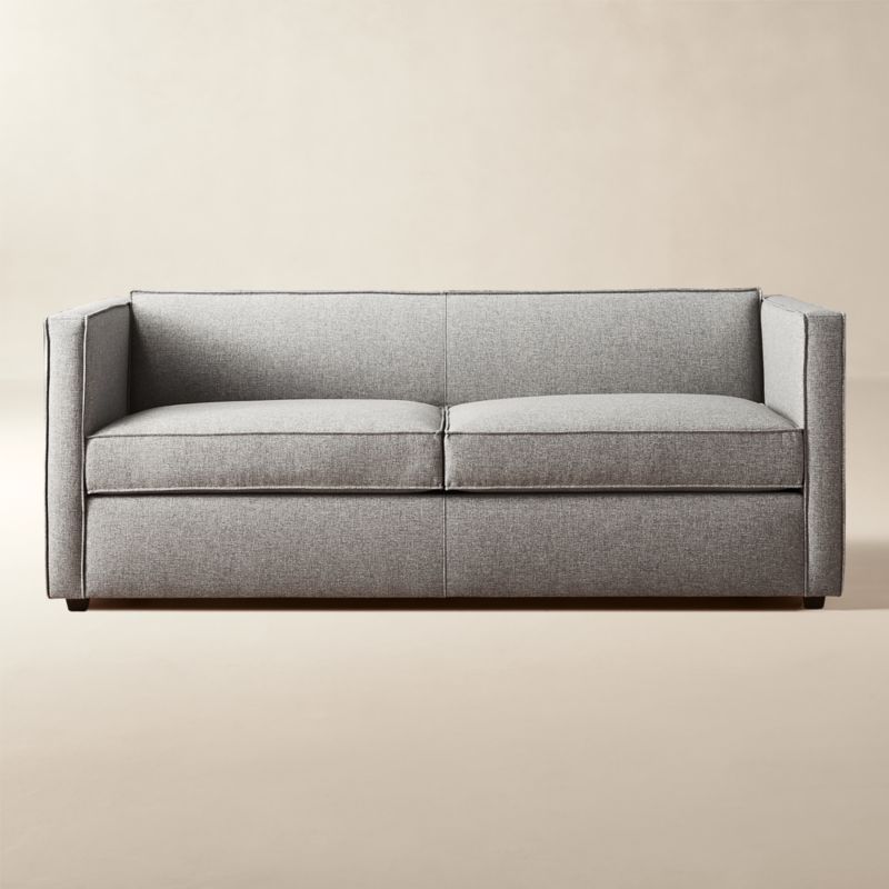 Sheltering sofa turns tradition on its edge. Compact two-seater with exaggerated flange outlines boxy design. Love the impromptu feel of the intentional seat cushion overhang and super comfy back that curves to relax/support just where you need it. Off with the cushions to pull out the coil/foam queen mattress in one smooth move.