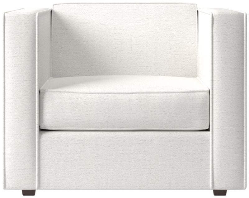 Our popular club chair squares up refined new proportions, scaled down ever so slightly with a fresh attitude. Exaggerated flange outlines boxy design that says 'this is my space.' Love the impromptu feel of the intentional seat cushion overhang and super comfy back that curves to relax/support just where you need it.