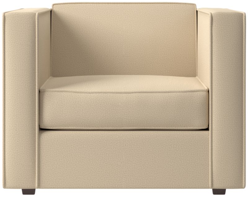 Our popular club chair squares up refined new proportions, scaled down ever so slightly with a fresh attitude. Exaggerated flange outlines boxy design that says 'this is my space.' Love the impromptu feel of the intentional seat cushion overhang and super comfy back that curves to relax/support just where you need it.