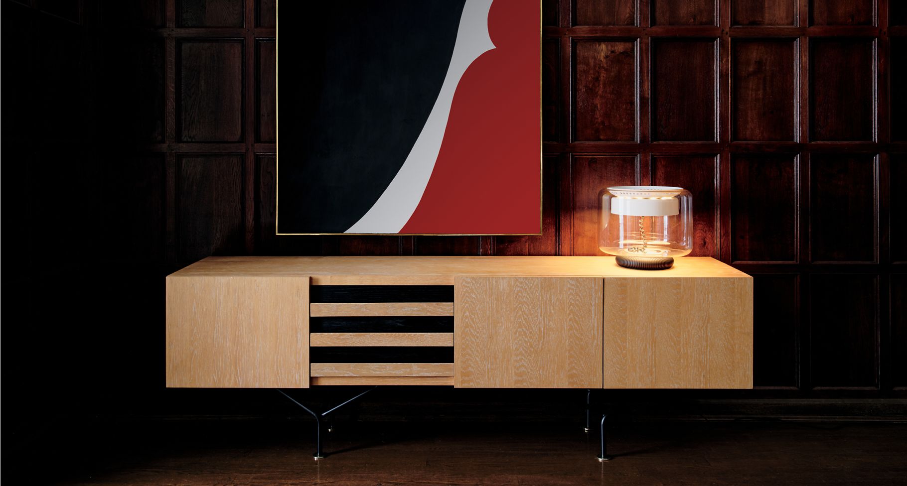 Among the most mysterious pieces in the Gianfranco Frattini collection, this oak credenza was rediscovered through a set of vintage black and white photographs. An example of his impeccable detailing, down to the champagne brass feet.