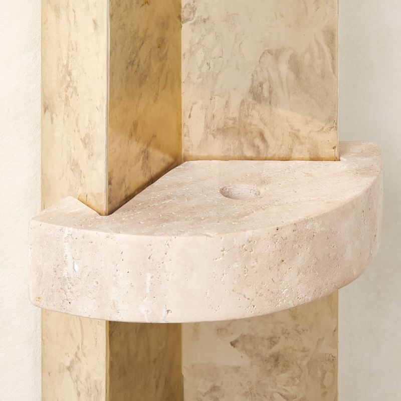 Large-scale wall sconce by NYC-based designer Farrah Sit marries warm travertine with tarnished silver. Slim, monolithic steel column appears to fold into a semi-circle of travertine sized to hold a pillar or taper candle. Through a multi-step process, each piece is hand-rubbed to achieve an antiqued effect that ensures no two are alike. CB2 exclusive.