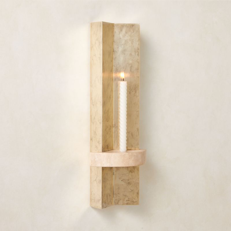 Large-scale wall sconce by NYC-based designer Farrah Sit marries warm travertine with tarnished silver. Slim, monolithic steel column appears to fold into a semi-circle of travertine sized to hold a pillar or taper candle. Through a multi-step process, each piece is hand-rubbed to achieve an antiqued effect that ensures no two are alike. CB2 exclusive.