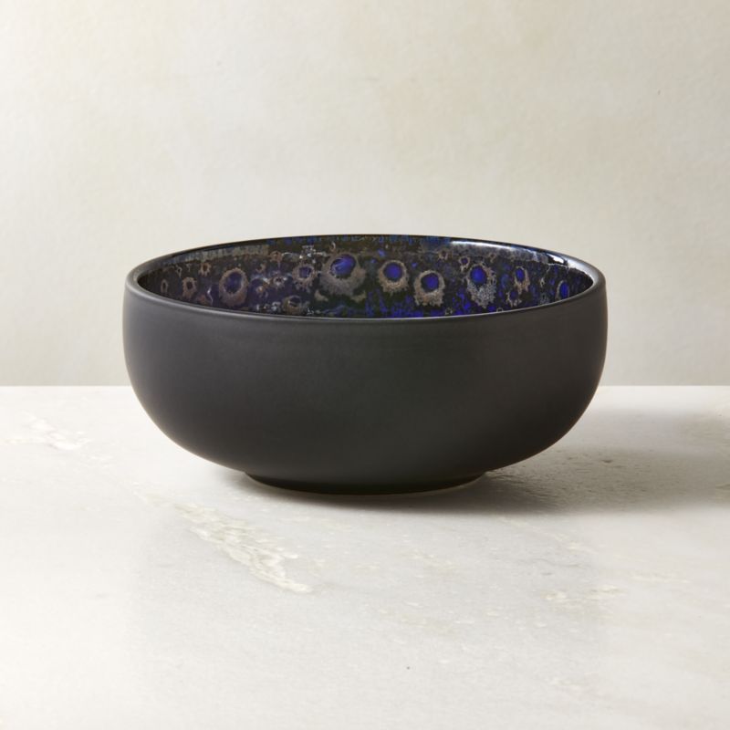 Statement-making soup bowl suits special occasions with its glossy cobalt blue finish. Accented with a reactive glaze around the rim, the bowl is marked by striking tonal variations and crackles in the glaze produced during firing. Part of the Cordelia cobalt blue dinnerware collection. CB2 exclusive.
