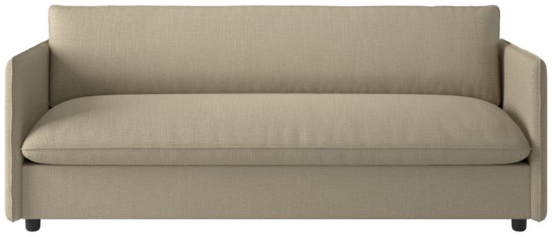 Built on a thin frame, Italian-inspired sofa brings a sense of lightness despite its oversized proportions. Transitioning easily between formal and informal settings, the sofa's slim silhouette and seamless armrests offer a modern aesthetic, while flange-trimmed linen upholstery in a tonal neutral nods to more traditional influences. CB2 exclusive.