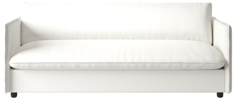 Built on a thin frame of kiln-dried engineered hardwood, Italian-inspired sleeper sofa brings a sense of lightness despite its oversized proportions. Transitioning easily between formal and informal settings, the sofa's slim silhouette and seamless armrests offer a modern aesthetic, while flange-trimmed linen upholstery in a tonal neutral nods to more traditional influences. Sleeper sofa unfurls to reveal a 5" thick queen mattress made with gel-infused memory foam for maximum comfort. CB2 exclusive.