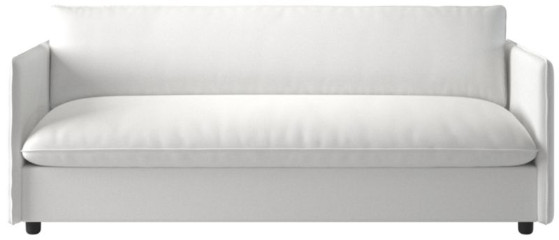 Built on a thin frame, Italian-inspired sofa brings a sense of lightness despite its oversized proportions. Transitioning easily between formal and informal settings, the sofa's slim silhouette and seamless armrests offer a modern aesthetic, while flange-trimmed linen upholstery in a tonal neutral nods to more traditional influences. CB2 exclusive.