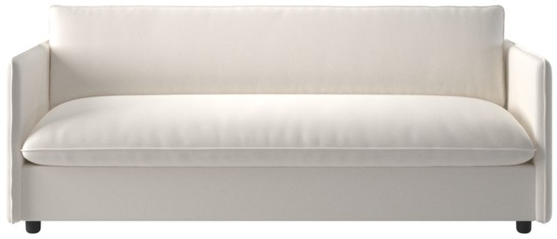 Built on a thin frame of kiln-dried engineered hardwood, Italian-inspired sleeper sofa brings a sense of lightness despite its oversized proportions. Transitioning easily between formal and informal settings, the sofa's slim silhouette and seamless armrests offer a modern aesthetic, while flange-trimmed linen upholstery in a tonal neutral nods to more traditional influences. Sleeper sofa unfurls to reveal a 5" thick queen mattress made with gel-infused memory foam for maximum comfort. CB2 exclusive.
