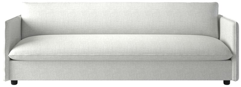 Built on a thin frame, Italian-inspired sofa brings a sense of lightness despite its oversized proportions. Transitioning easily between formal and informal settings, the sofa's slim silhouette and seamless armrests offer a modern aesthetic, while flange-trimmed linen upholstery in a tonal neutral nods to more traditional influences. CB2 exclusive.