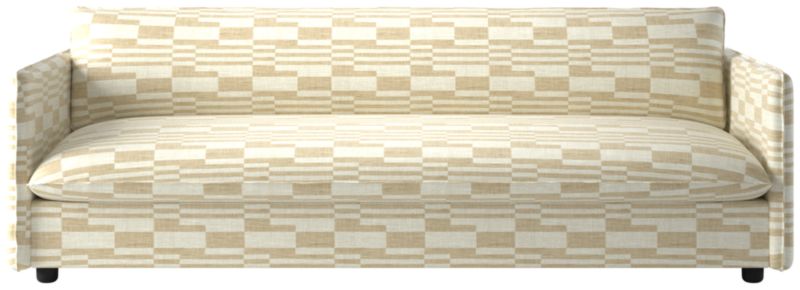 Built on a thin frame, Italian-inspired sofa brings a sense of lightness despite its oversized proportions. Transitioning easily between formal and informal settings, the sofa's slim silhouette and seamless armrests offer a modern aesthetic, while flange-trimmed linen upholstery in a tonal neutral nods to more traditional influences. CB2 exclusive.