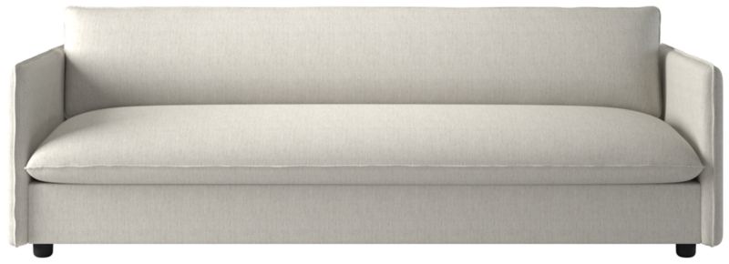 Built on a thin frame, Italian-inspired sofa brings a sense of lightness despite its oversized proportions. Transitioning easily between formal and informal settings, the sofa's slim silhouette and seamless armrests offer a modern aesthetic, while flange-trimmed linen upholstery in a tonal neutral nods to more traditional influences. CB2 exclusive.