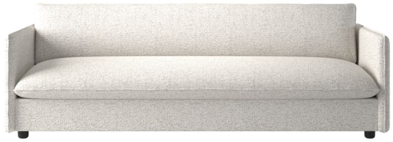 Built on a thin frame, Italian-inspired sofa brings a sense of lightness despite its oversized proportions. Transitioning easily between formal and informal settings, the sofa's slim silhouette and seamless armrests offer a modern aesthetic, while flange-trimmed linen upholstery in a tonal neutral nods to more traditional influences. CB2 exclusive.