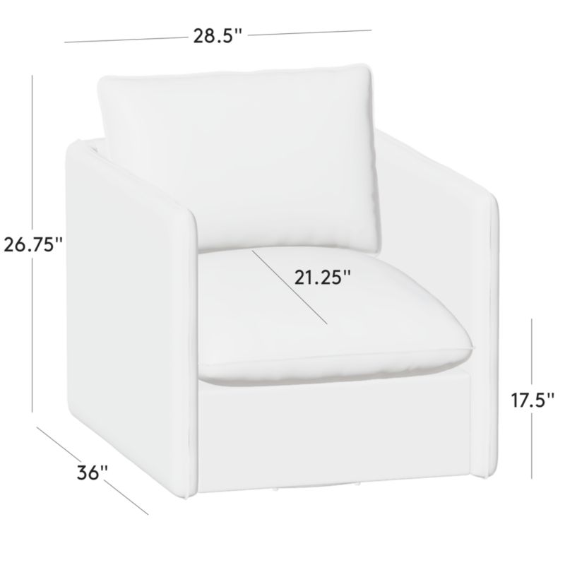 Richly textured upholstery, a smooth 360-degree swivel and pillowy cushions make this Italian-inspired swivel chair an instant classic. Assembled in Mississippi, the frame is benchmade with kiln-dried hardwood certified sustainable by the Forest Stewardship Council ® (FSC). Transitioning seamlessly between formal and informal settings, the slim silhouette offers a modern aesthetic, while flange seams nod to more traditional influences. CB2 exclusive.