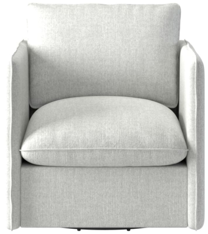 Richly textured upholstery, a smooth 360-degree swivel and pillowy cushions make this Italian-inspired swivel chair an instant classic. Assembled in Mississippi, the frame is benchmade with kiln-dried hardwood certified sustainable by the Forest Stewardship Council ® (FSC). Transitioning seamlessly between formal and informal settings, the slim silhouette offers a modern aesthetic, while flange seams nod to more traditional influences. CB2 exclusive.