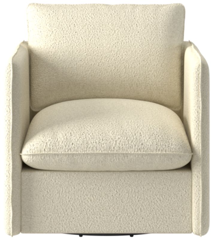 Richly textured upholstery, a smooth 360-degree swivel and pillowy cushions make this Italian-inspired swivel chair an instant classic. Assembled in Mississippi, the frame is benchmade with kiln-dried hardwood certified sustainable by the Forest Stewardship Council ® (FSC). Transitioning seamlessly between formal and informal settings, the slim silhouette offers a modern aesthetic, while flange seams nod to more traditional influences. CB2 exclusive.