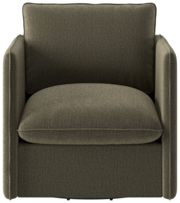 Richly textured upholstery, a smooth 360-degree swivel and pillowy cushions make this Italian-inspired swivel chair an instant classic. Assembled in Mississippi, the frame is benchmade with kiln-dried hardwood certified sustainable by the Forest Stewardship Council® (FSC). Transitioning seamlessly between formal and informal settings, the slim silhouette offers a modern aesthetic, while flange seams nod to more traditional influences. CB2 exclusive.