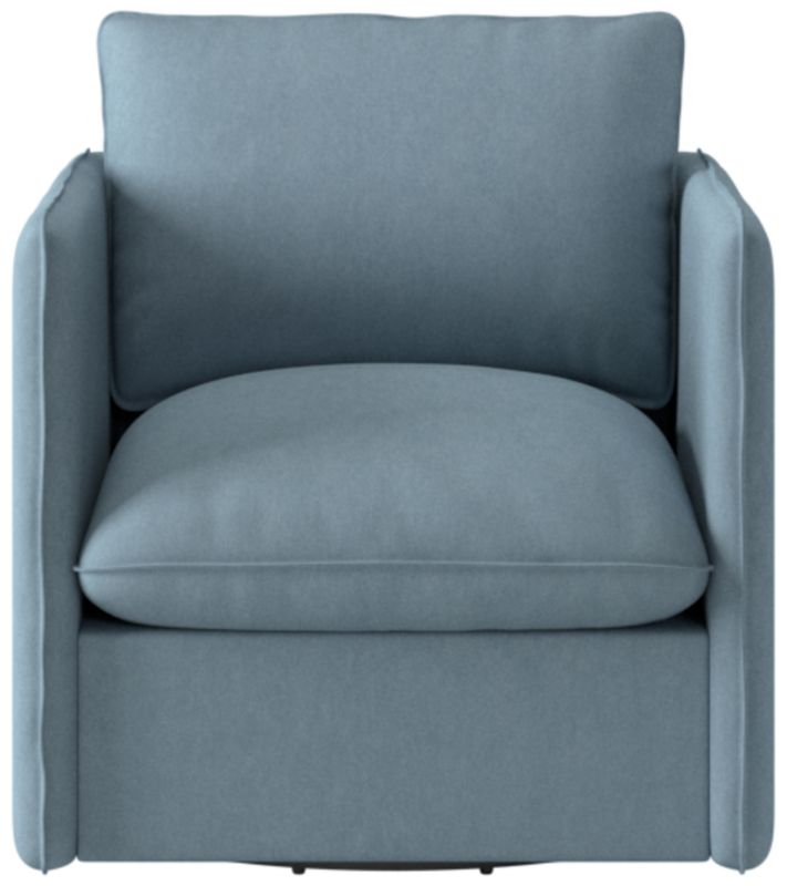 Richly textured upholstery, a smooth 360-degree swivel and pillowy cushions make this Italian-inspired swivel chair an instant classic. Assembled in Mississippi, the frame is benchmade with kiln-dried hardwood certified sustainable by the Forest Stewardship Council ® (FSC). Transitioning seamlessly between formal and informal settings, the slim silhouette offers a modern aesthetic, while flange seams nod to more traditional influences. CB2 exclusive.
