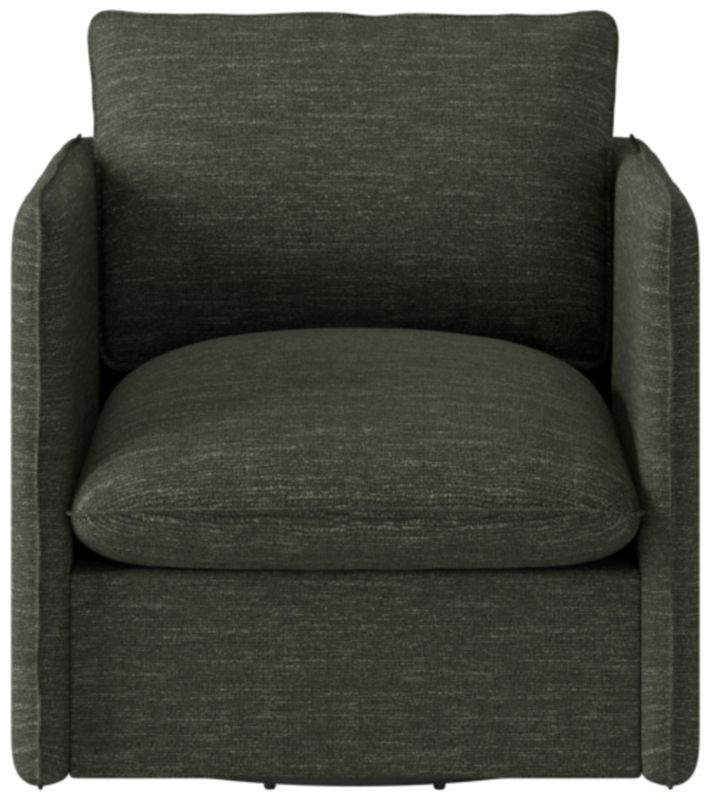 Richly textured upholstery, a smooth 360-degree swivel and pillowy cushions make this Italian-inspired swivel chair an instant classic. Assembled in Mississippi, the frame is benchmade with kiln-dried hardwood certified sustainable by the Forest Stewardship Council ® (FSC). Transitioning seamlessly between formal and informal settings, the slim silhouette offers a modern aesthetic, while flange seams nod to more traditional influences. CB2 exclusive.